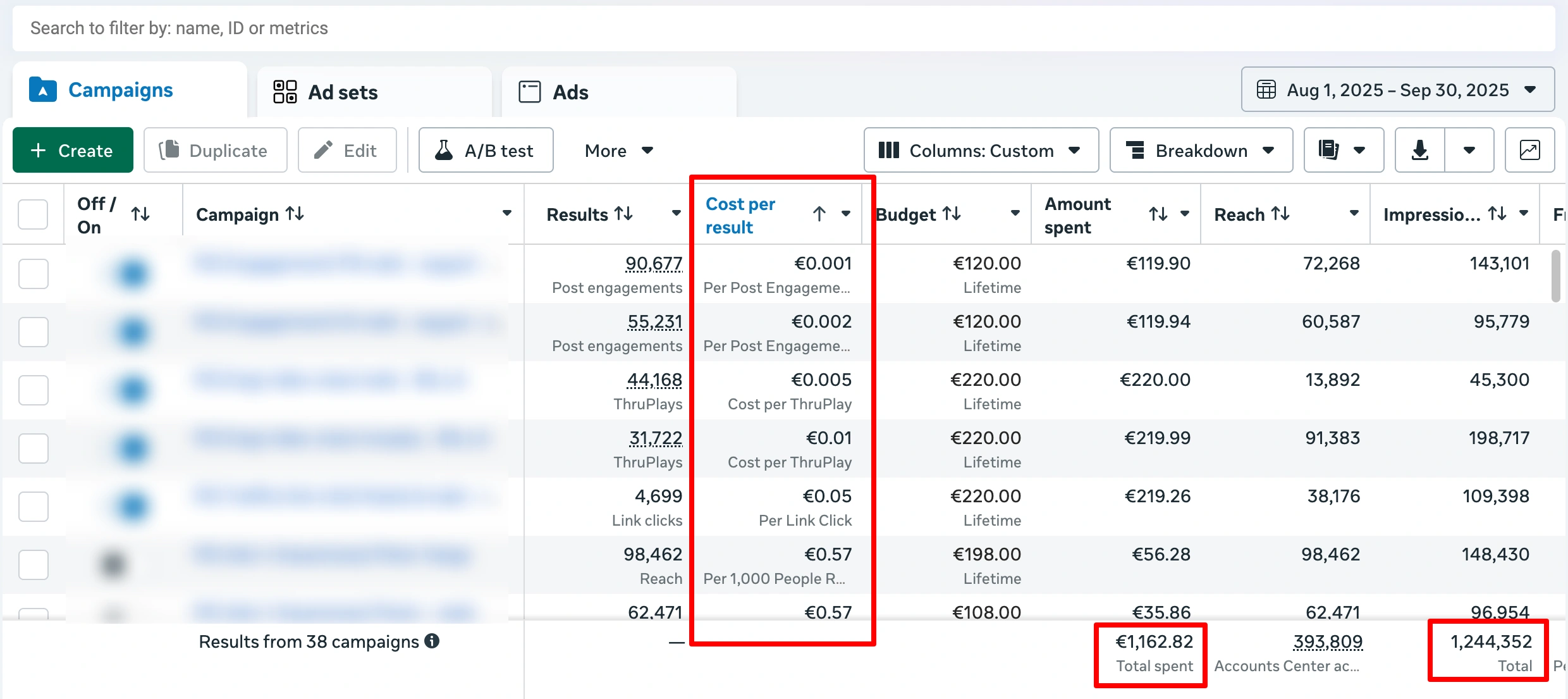 Ukážka stratégie, kde sme kombináciou rôznych optimalizačných cieľov dosiahli mimoriadne nízke náklady na impresie, interakcie a zhliadnutia obsahu. Tento prístup umožňuje doručiť vašu značku k maximálnemu počtu ľudí pri minimálnych výdavkoch.